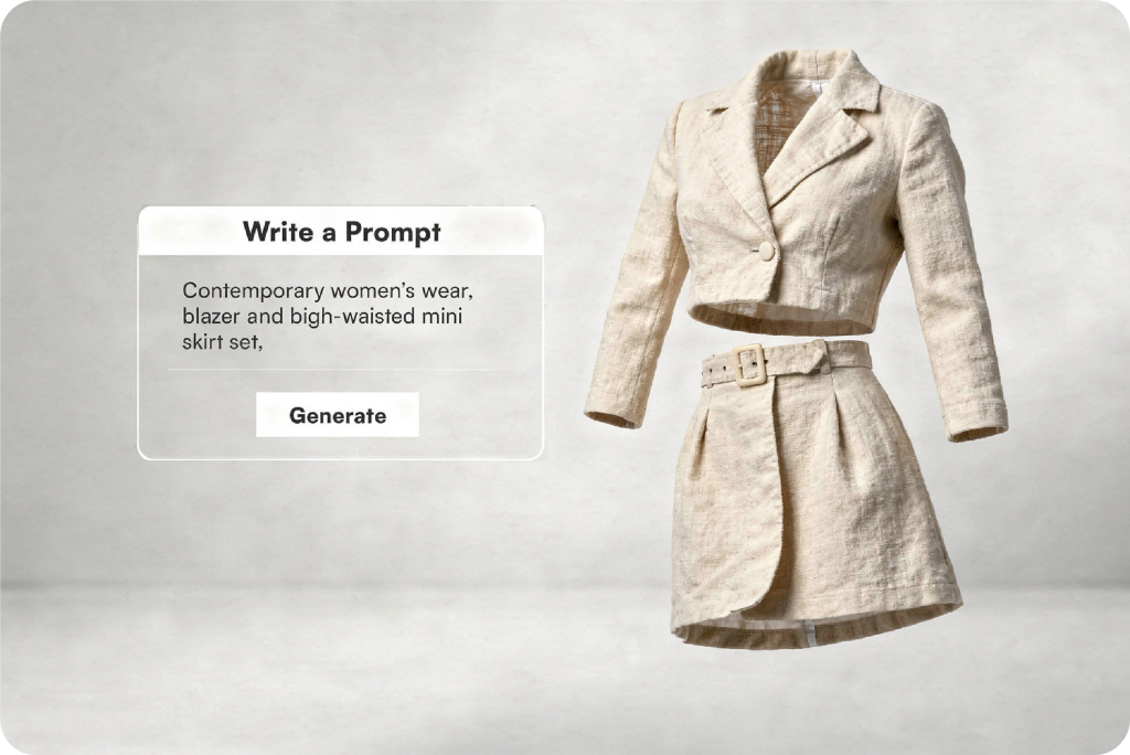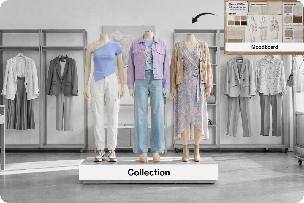 Upload your moodboard, images, PDF boards, or a URL – Collection Lab reads your inspiration and builds a full product collection around it. Choose your garment type and quantity, and the platform does the rest.