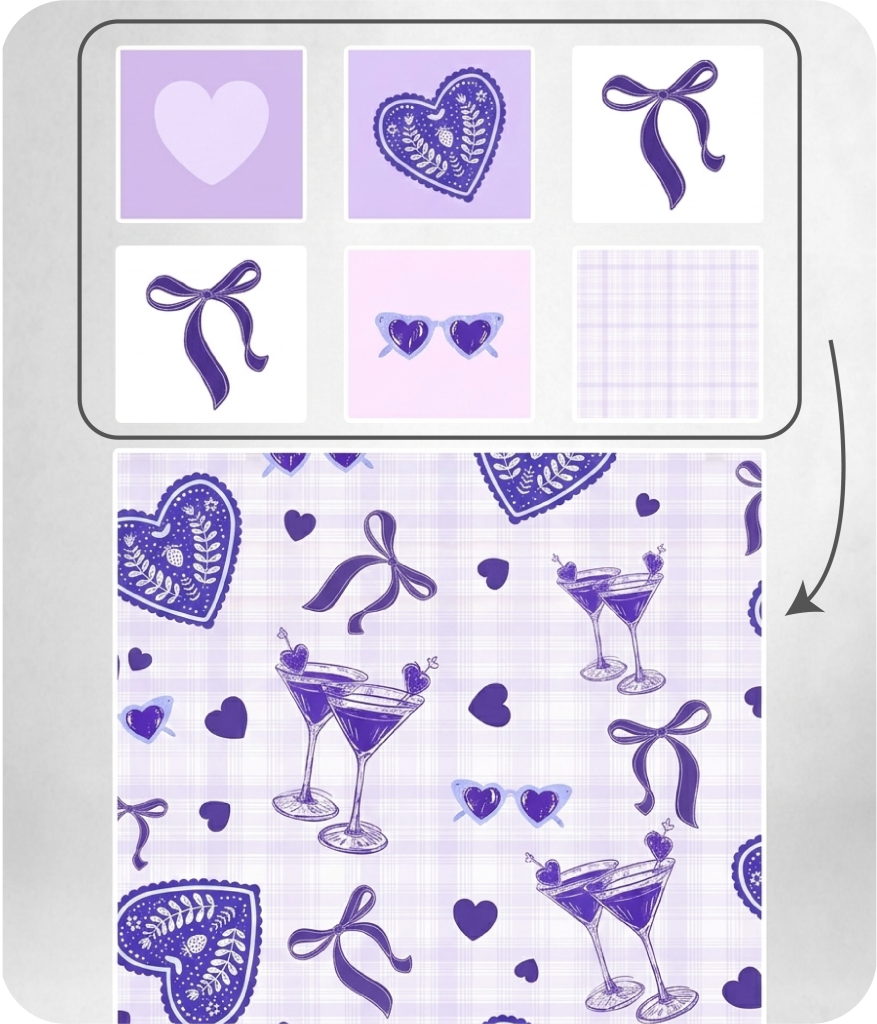 A blank canvas tool for building seamless repeat patterns from scratch. You bring your own motifs and elements - the tool handles the construction, preview, and export.
