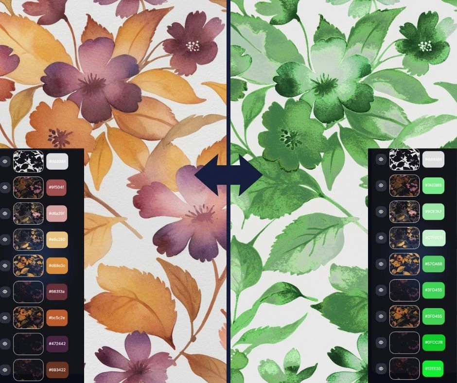 MYTH AI features a powerful colorway system that allows users to recolor RGB (flattened) or multi-layered designs without disturbing color harmony or design effects. Our textile-specific algorithms enable: